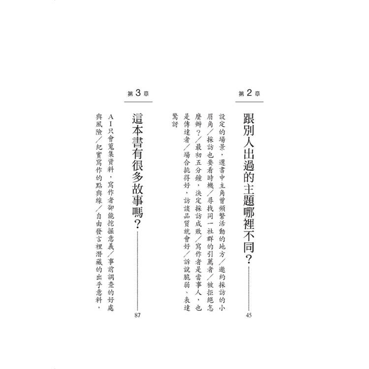 AI只會蒐集資料,寫作者卻能挖掘意義/事前調查的好處與風險/紀實寫作的點與線/自由發言裡潛藏的出乎意料,才是寶藏/訪談,是為了顛覆自己的價值觀/由多個小故事,構成主線大故事/以受訪者的視角看世界/與受訪對象保持距離感/受訪者不擅長表達?用這三招/不只聽其言,還要觀其行/透過觀察,替當事人發聲