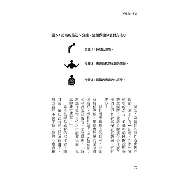 設定的場景,選書中主角曾頻繁活動的地方/邀約採訪的小眉角/採訪也要看時機/尋找同一社群的引薦者/被拒絕怎麼辦?/最初五分鐘,決定採訪成敗/寫作者是當事人,也是傳達者/場合挑得好,訪談品質就會好/訴說脆弱、表達驚訝