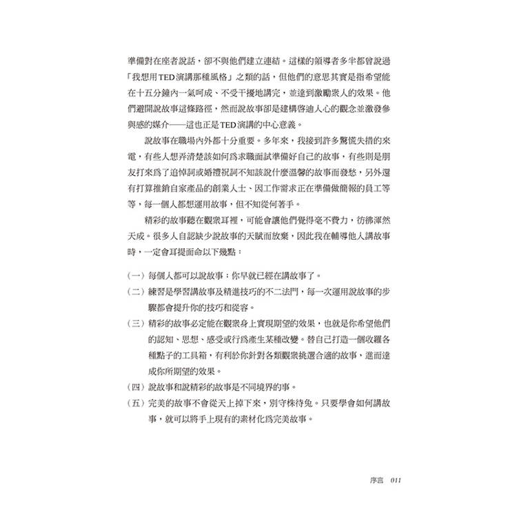 收錄近20位頂尖說故事專家的經驗,包含皮克斯前創意總監、《The Moth》製作人、《TED Radio Hour》主持人等。