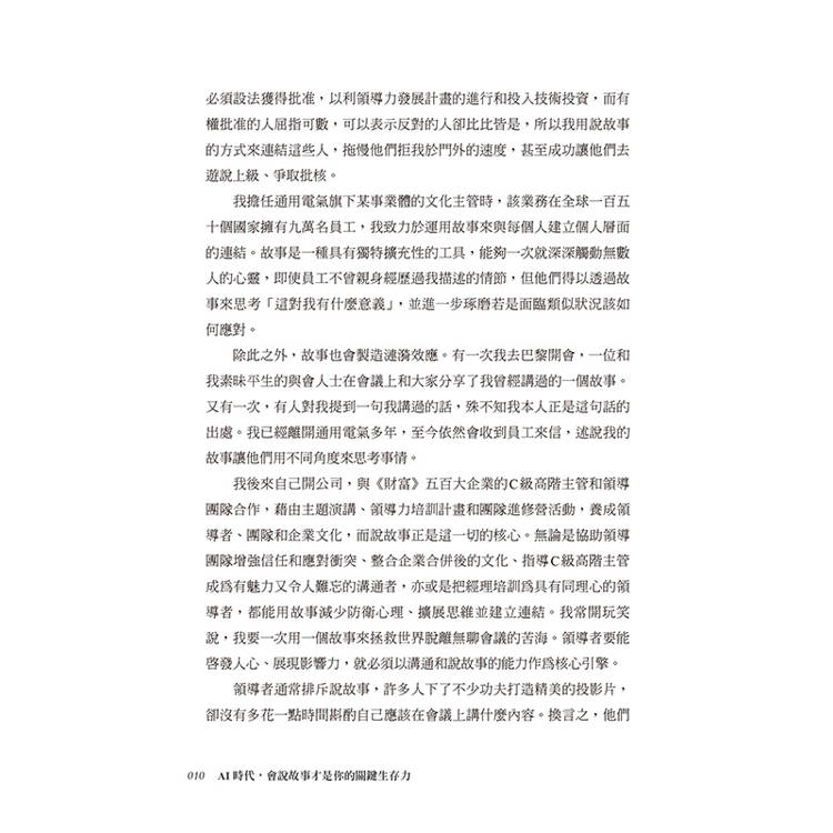 《AI時代,會說故事才是你的關鍵生存力》是領導和商業專業人士掌握說故事藝術不可或缺的資源。這本書的綜合方法,為讀者提供建立激勵人心的願景和使命、傳遞引人入勝的演講和建立受喜愛品牌的工具。這是任何想要掌握說故事藝術並提升其領導與商業技能的人,必讀之書。
