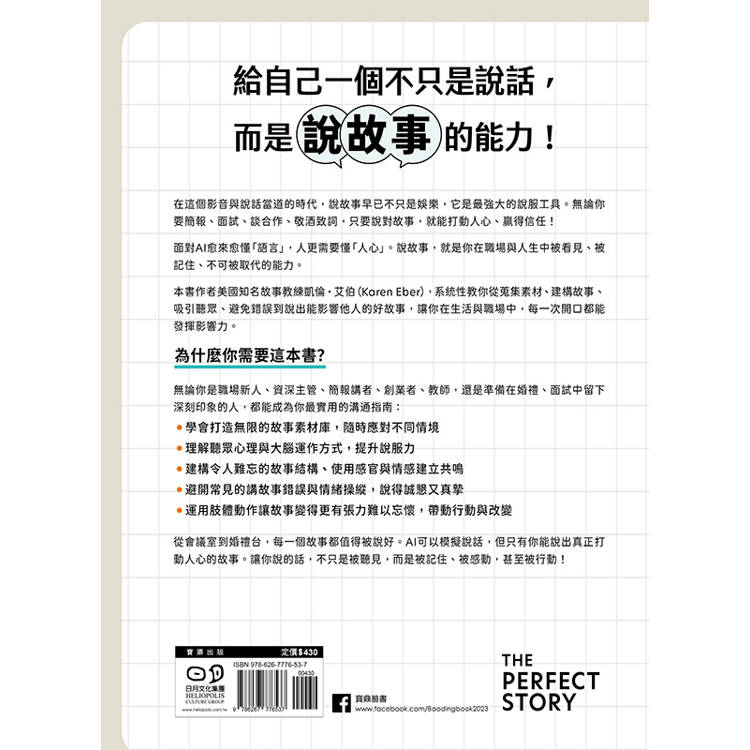 本書由美國知名故事教練凱倫・艾伯(Karen Eber)撰寫,系統性教你從蒐集素材、建構故事、吸引聽眾、避免錯誤到說出能影響他人的好故事,讓你在生活與職場中,每一次開口都能發揮影響力。