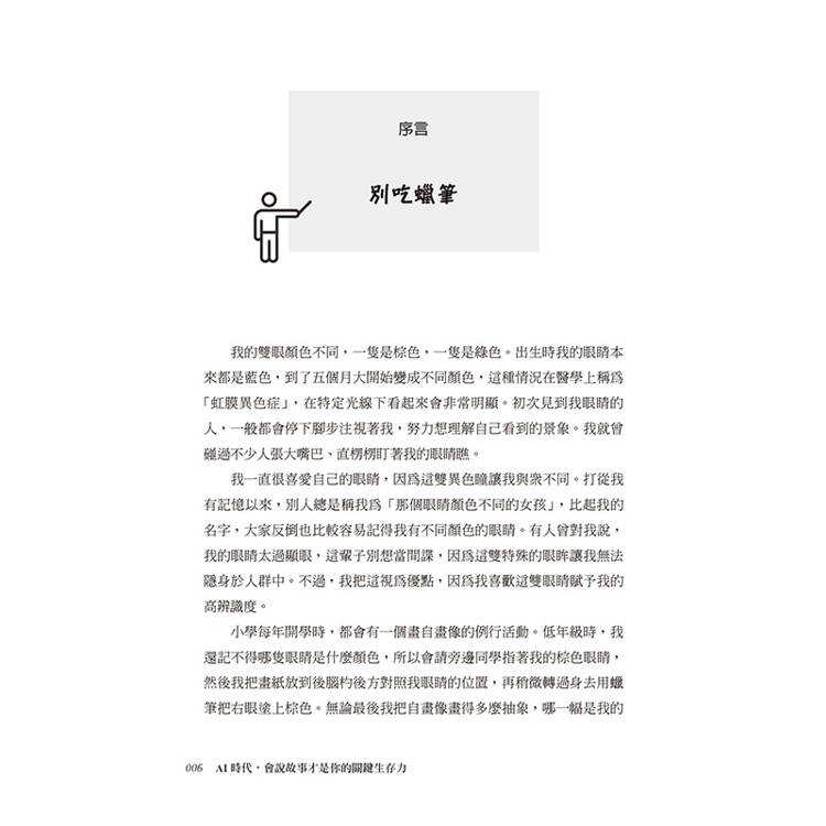 《AI時代,會說故事才是你的關鍵生存力》是一本針對需要提升創作影響力的初學者和資深說故事人的完美書籍。運用最新科學、具體例子和檢查清單,《AI時代,會說故事才是你的關鍵生存力》將立即改善我們影響別人的方式──說故事。