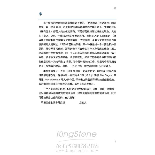 本集中收集了一些自1990 年以來開始寫的散文. 有的從已經發表我譯的書的序改寫, 譯書中有一些西方名作家(如卡爾.沙根 Carl Sagan, 萊得曼 Alan Lightman 等人)的作品。譯序表達的是我譯書時的感想及感觸。有的散文則是我自己偶發的感觸,其中有些未發表過。