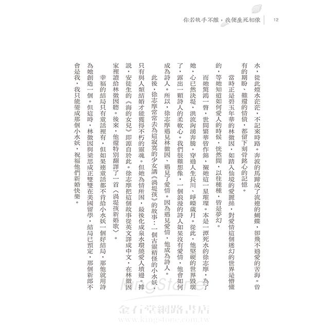 幸福的結局只有童話裡有,但如果連童話都不肯給小水妖一個好結局,那他就用詩為她創造一個。但這時,林徽因與梁思成正雙雙在美國留學,結局已預定,那個新郎不會是我,我只能變成那個小水妖,祝福他們新婚快樂。