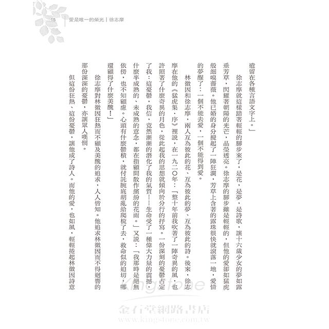 在徐志摩浪漫的月光沐浴下,林徽因這一朵小花微微地綻放了。她是每一瓣靜處的月明,而徐志摩成了她記憶梗上,那兩三朵娉婷、披著情緒的花。