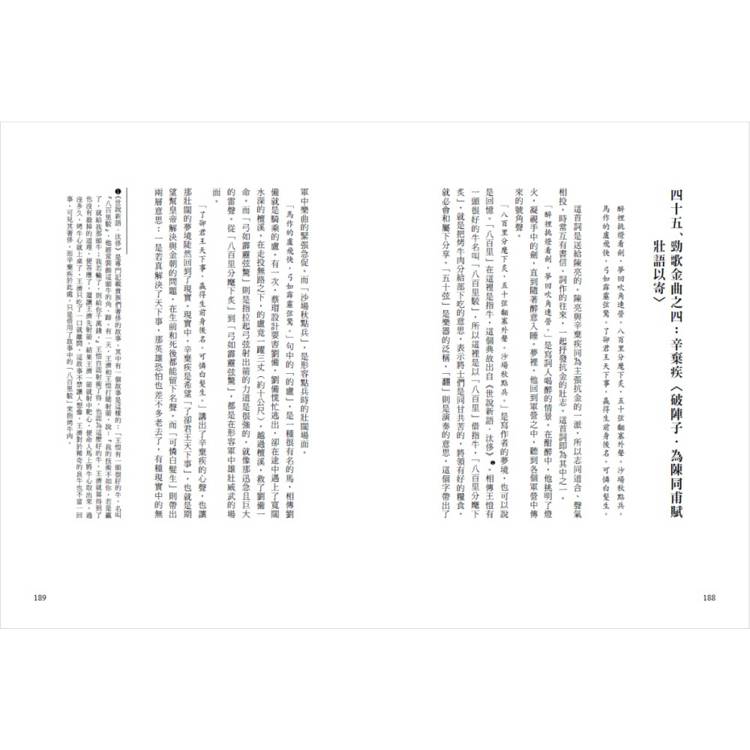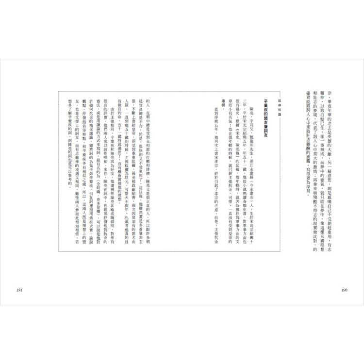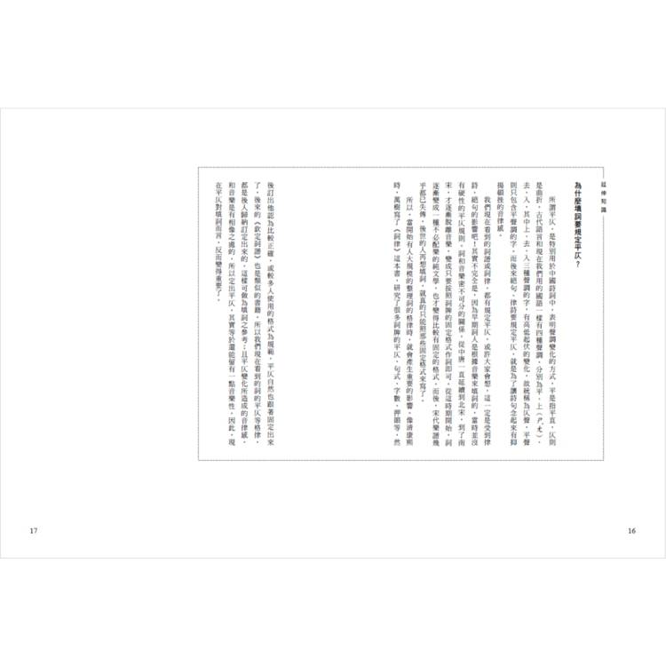 我們這本書,其實也就是希望盡量用簡單、輕鬆但把握重點的方式,介紹那些值得一讀再讀的作品、優秀的作者、創作的藝術、詞的發展變化……等,也兼及和詞有關的趣味故事,希望能呈現出詞的多種面貌,畢竟詞不是死板平面的文學,應該是活生生而立體的。此外,詞雖從唐朝開端,歷經五代、宋朝而興盛,宋以後一度沒落,到清初才又復興,但最輝煌的時期是在宋朝。因此本書也以介紹宋朝的詞人、詞作為主,不過詞既然是跨越了幾代的文學,很難完全斷開與前代、後朝的關係,所以書中的內容,也會兼及其他朝代的詞作與詞人,作為更完整的補充。現在,就讓我們一起來進入豐富而多樣的詞的世界吧!