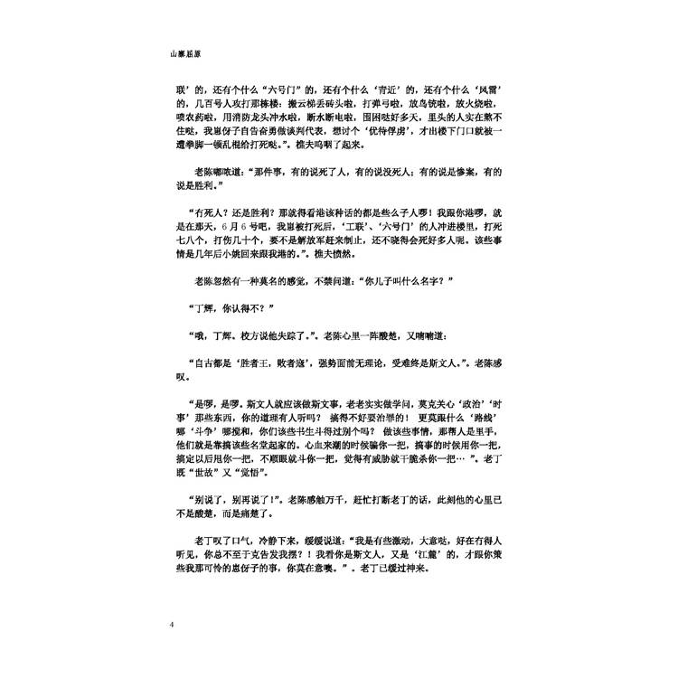 “是囉,是囉。斯文人就應該做斯文事,老老實實做學問,莫克關心‘政治’‘時事’那些東西,你的道理有人聽嗎? 搞得不好要治罪的! 更莫跟什麼‘路線’哪‘鬥爭’哪攪和,你們該些書生鬥得過別個嗎? 做該些事情,那幫人是裡手,他們就是靠搞該些名堂起家的。心血來潮的時候騙你一把,搞事的時候用你一把,搞定以後甩你一把,不順眼就鬥你一把,覺得有威脅就乾脆殺你一把… ”。老丁既“世故”又“覺悟”。