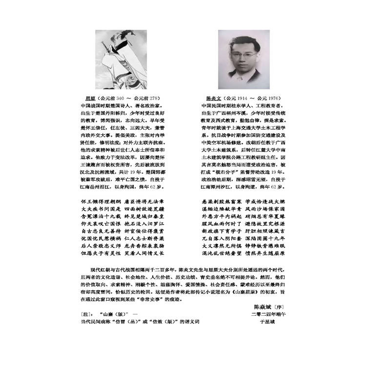 作者陳焱斌通過將陳炎文與古代屈原模擬,指出二人在價值取向、愛國情操、蒙難經歷等方面高度相似,以此揭示歷史中的某些“非常史事”。書名“山寨屈原”意在強調這種仿效性的對比。