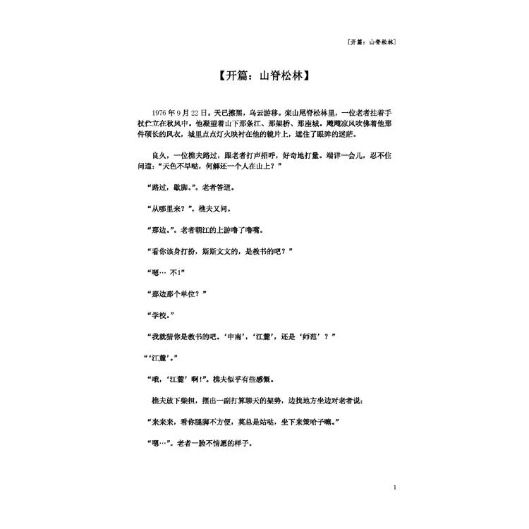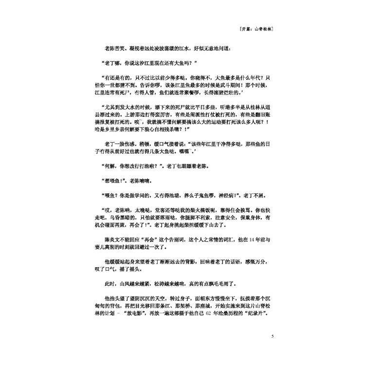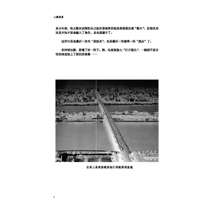 他抬頭望瞭望陰沉沉的天空,轉過身子,面朝東方慢慢坐下,撫摸著那個沉甸甸的背包,再把目光移回那條江、那架橋、那座城,開始實施來到這片山脊松林的計畫 - “放電影”,再放一遍這部攝於他自己62年滄桑歷程的“紀錄片”。多少年來,他無數次試圖把自己放在旁觀者的視角來觀看這部“影片”,但每次卻還是不知不覺地融入了角色,總也逃避不了。