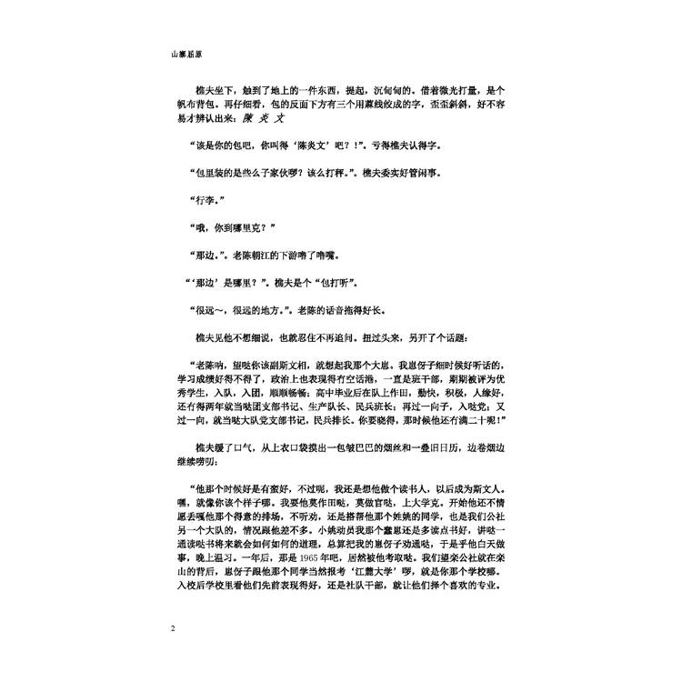 樵夫坐下,觸到了地上的一件東西,提起,沉甸甸的。借著微光打量,是個帆布背包。再仔細看,包的反面下方有三個用蔴線絞成的字,歪歪斜斜,好不容易才辨認出來:陳 炎 文
