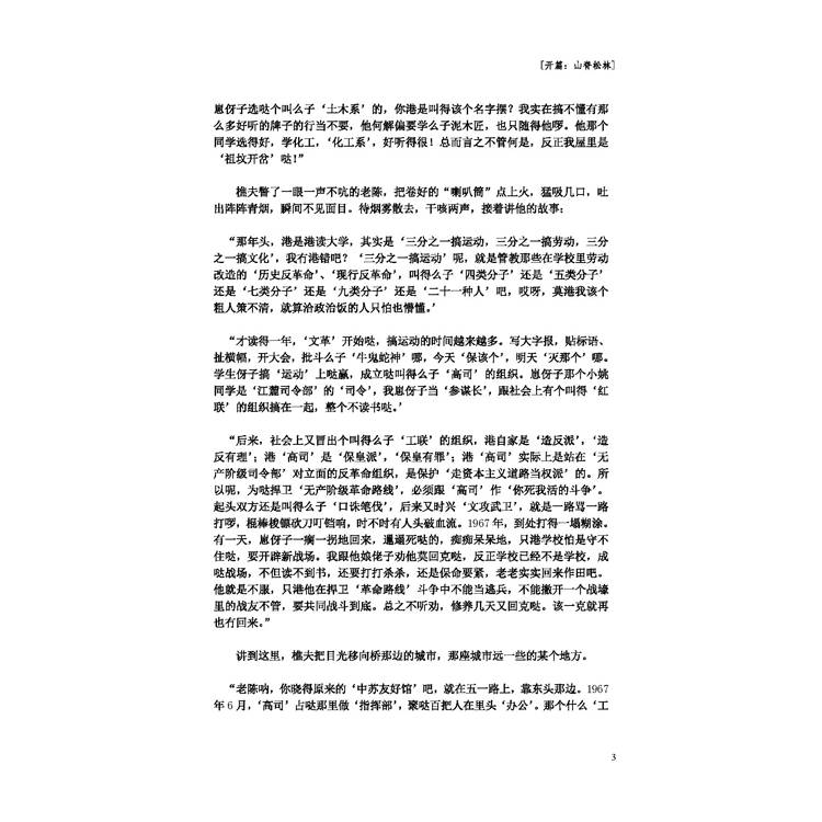 “後來,社會上又冒出個叫得麼子‘工聯’的組織,港自家是‘造反派’,‘造反有理’;港‘高司’是‘保皇派’,‘保皇有罪’;港‘高司’實際上是站在‘無產階級司令部’對立面的反革命組織,是保護‘走資本主義道路當權派’的。所以呢,為噠捍衛‘無產階級革命路線’,必須跟‘高司’作‘你死我活的鬥爭’。起頭雙方還是叫得麼子‘口誅筆伐’,後來又時興‘文攻武衛’,就是一路罵一路打囉,棍棒梭鏢砍刀叮鐺響,時不時有人頭破血流。1967年,到處打得一塌糊塗。有一天,崽伢子一瘸一拐地回來,邋遢死噠的,癡癡呆呆地,只港學校怕是守不住噠,要開闢新戰場。我跟他娘佬子勸他莫回克噠,反正學校已經不是學校,成噠戰場,不但讀不到書,還要打打殺殺,還是保命要緊,老老實實回來作田吧。他就是不服,只港他在捍衛‘革命路線’鬥爭中不能當逃兵,不能撇開一個戰壕裡的戰友不管,要共同戰鬥到底。總之不聽勸,修養幾天又回克噠。該一克就再也冇回來。”