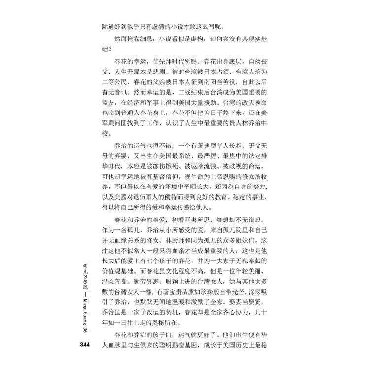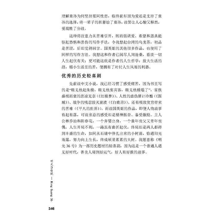 先前讀中文小說,我已經習慣了感受痛苦,因為書裡寫的是“眼見他起朱樓,眼見他宴賓客,眼見他樓塌了”,家族盛極而衰的悲涼無奈(《紅樓夢》)、人性的虛偽算計冷酷(《圍城》)、戰爭的殘忍毀滅崩潰(《白鹿原》)、還有極致貧窮帶來的苦難(《平凡的世界》)。而讀國英姐的作品,即便人物故事有起有落,可讀來總的感受卻是精神振奮、備受激勵。主人公林喬治和陳春花,一個棄嬰出身,一個童年喪父又青年喪偶,人生開局不利,一路雖有曲折起伏,終局卻是兩人都得到豐盛的生命,如同從石縫中掙扎出來的小樹苗,恰遇陽光雨露,努力向上生長,終成碩果累累的大樹。我願意稱《明光36號》為一部歷史題材的輕喜劇,因為這是一個普通人遇見好時代,善良人碰到好運氣,好人有好報的故事。