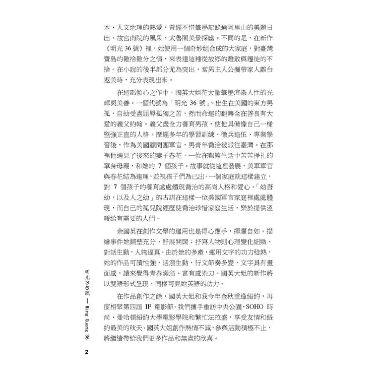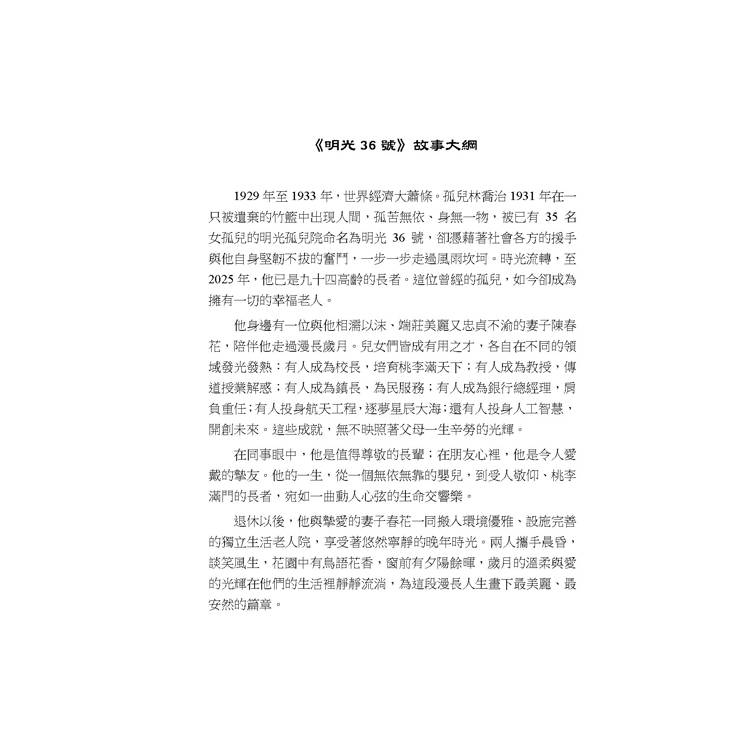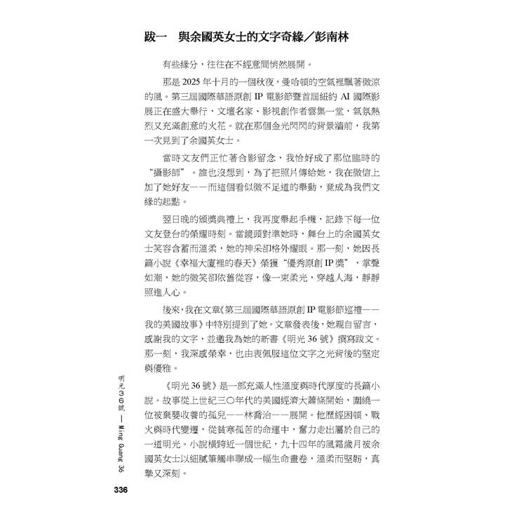 《明光36號》是一部充滿人性溫度與時代厚度的長篇小說。故事從上世紀三〇年代的美國經濟大蕭條開始,圍繞一位被棄嬰收養的孤兒——林喬治——展開。他歷經困頓、戰火與時代變遷,從貧寒孤苦的命運中,奮力走出屬於自己的一道明光。小說橫跨近一個世紀,九十四年的風霜歲月被余國英女士以細膩筆觸串聯成一幅生命畫卷,溫柔而堅韌,真摯又深刻。