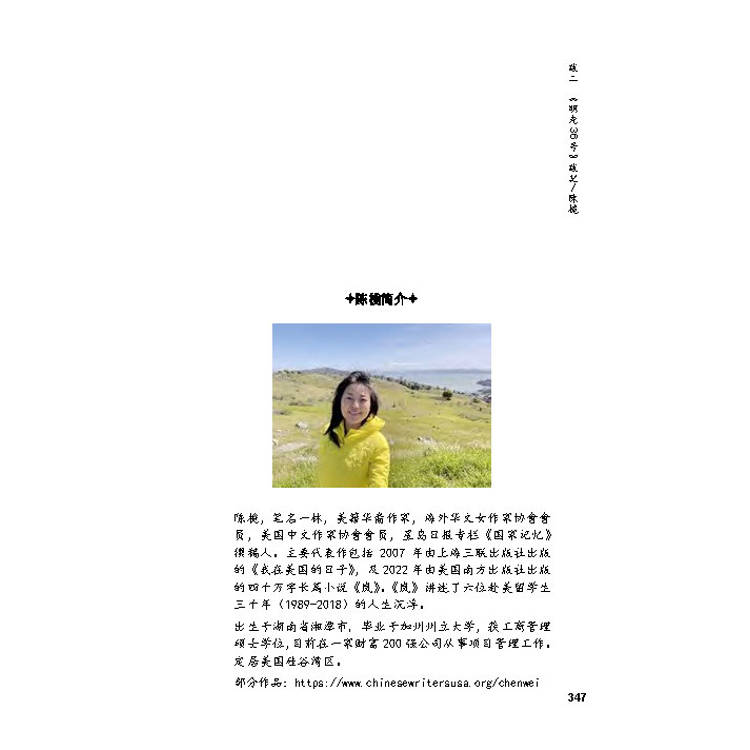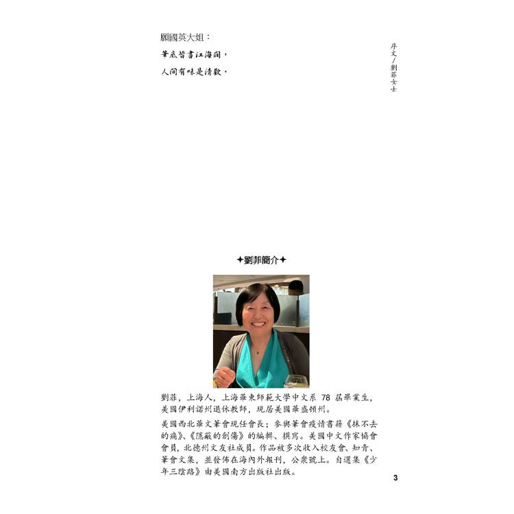 目前,她定居於加州奥克蘭市,依然筆耕不輟,持續活躍於北美華文文壇,曾任北美華文作家聯誼會副會長、世界華文女作家協會秘書長等職。她的作品總能以靜謐筆調呈現人心的堅強與柔軟,讓人在現實的縫隙裡,看見希望的微光。