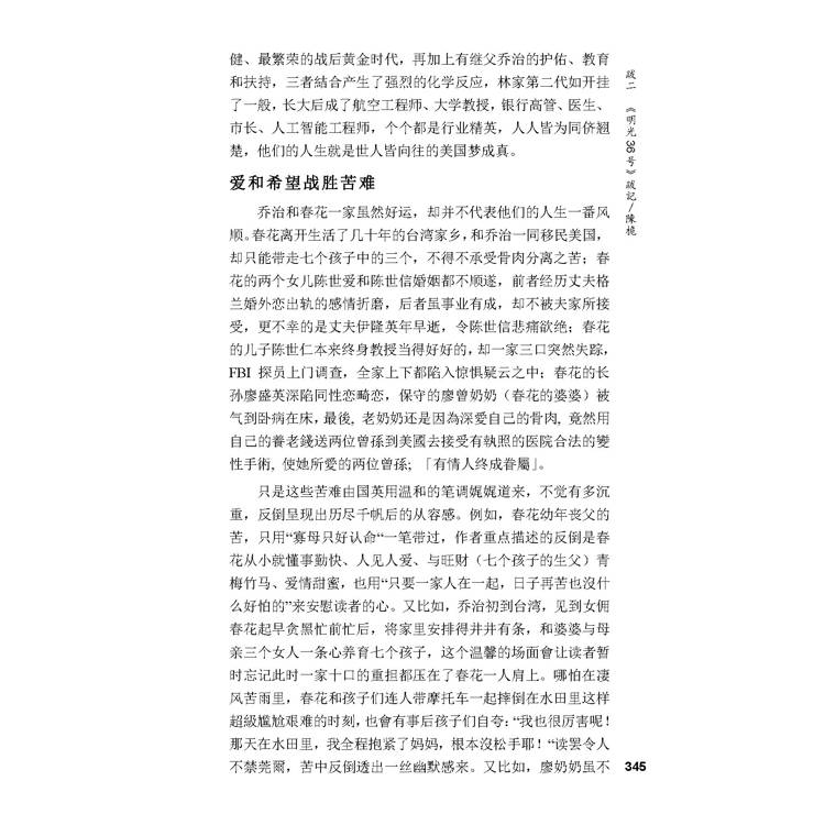 春花和喬治的孩子們,運氣就更好了。他們出生便有華人血脈裡與生俱來的聰明勤奮基因,成長於美國歷史上最穩健、最繁榮的戰後黃金時代,再加上有繼父喬治的護佑、教育和扶持,三者結合產生了強烈的化學反應,林家第二代如開掛了一般,長大後成了航空工程師、大學教授,銀行高管、醫生、市長、人工智慧工程師,個個都是行業精英,人人皆為同儕翹楚,他們的人生就是世人皆嚮往的美國夢成真。