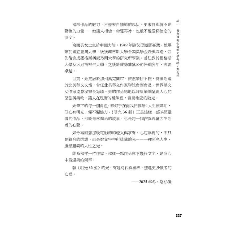 她筆下的每一個角色,都似乎在向我們低語:人生雖漂泊,但心有明光,便不懼遠方。《明光36號》正是這樣一部映照靈魂的作品。那既是林喬治的故事,也是每一個在異鄉奮力生活者的心聲。