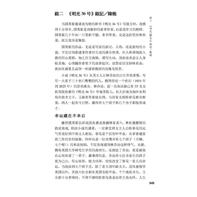 當國英姐邀請我為她的新書《明光36號》寫跋文時,我感到十分榮幸。國英姐是我敬仰的前輩作家,也是我學習的榜樣。國英姐幾十年如一日筆耕不輟,著書等身,光是這份堅持和熱愛,就讓我很是佩服。