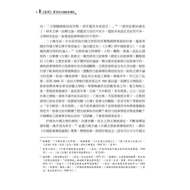 二十幾年前,中央研究院中國文哲研究所舉辦國際學術研討會,邀請美國史丹福大學王靖宇發表論文,論文題目為〈《左傳》與中國敘事文〉,大會邀我擔任特約討論人。王教授論文持情節、人物、觀點、意義、成品五個視角,以解讀《左傳》敘事文,顯然持西方敘事學(頗近小說敘事學)觀點探討《左傳》之歷史敘事。我不贊同他的論述,舉出歷史敘事與小說敘事不同,傳統敘事學與西方敘事學亦有差異諸觀點。王教授當時並沒有太多回應,倒是引發了歐美研究所單德興發言,歷數西方敘事學的學說和流派,附和王靖宇論文的見解。形成一種敘事學,彼此各自表述之窘境。事隔多年,早已忘了此事。直到2006年,成功大學執行教育部五年500億計畫,我擔任文學院長,教育部聘來專家學者評鑑文學院,單德興赫然在評鑑委員之列。賓主寒暄之後,單教授重提過往,述說當年事,且稱「少年輕狂,多有得罪」云云。回思往事之情境,當時不過各說各話而已,了無交集,可見單教授言重了。王教授當時已是知名學者,我質疑有關《左傳》敘事文的觀點,是否可取?單教授所云「年少輕狂,多有得罪」,是不是更適用於我?這背後隱然有些學術課題值得思考:敘事文如何解讀?歷史敘事如何詮釋?東西方敘事學是否殊途異轍?中國傳統之敘事學有無自家的「話語權」?都值得探索追求。