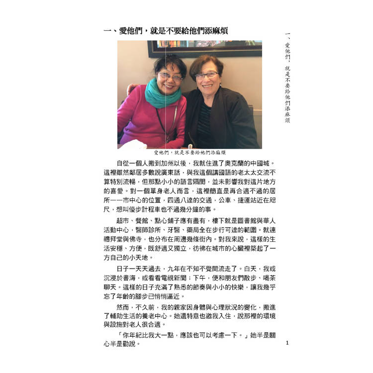 然而,不久前,我的親家因身體與心理狀況的變化,搬進了輔助生活的養老中心。她還特意也邀我入住,說那裡的環境與設施對老人很合適。