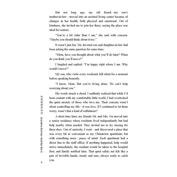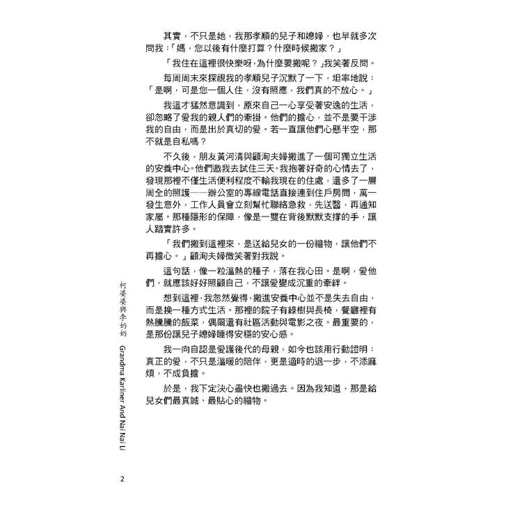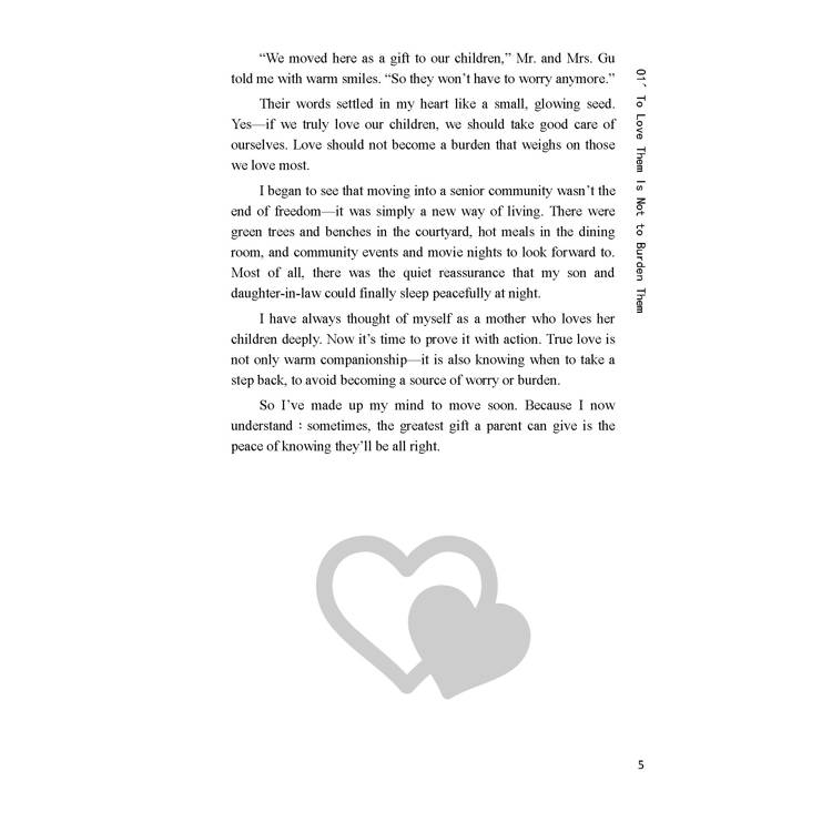 想到這裡,我忽然覺得,搬進安養中心並不是失去自由,而是換一種方式生活。那裡的院子有綠樹與長椅,餐廳裡有熱騰騰的飯菜,偶爾還有社區活動與電影之夜。最重要的,是那份讓兒子媳婦睡得安穩的安心感。