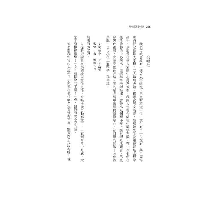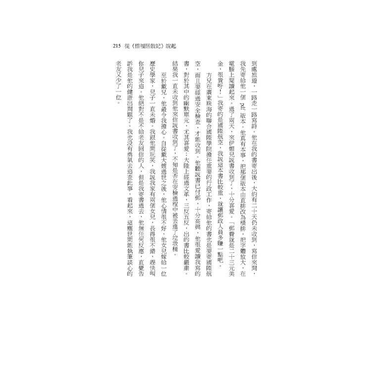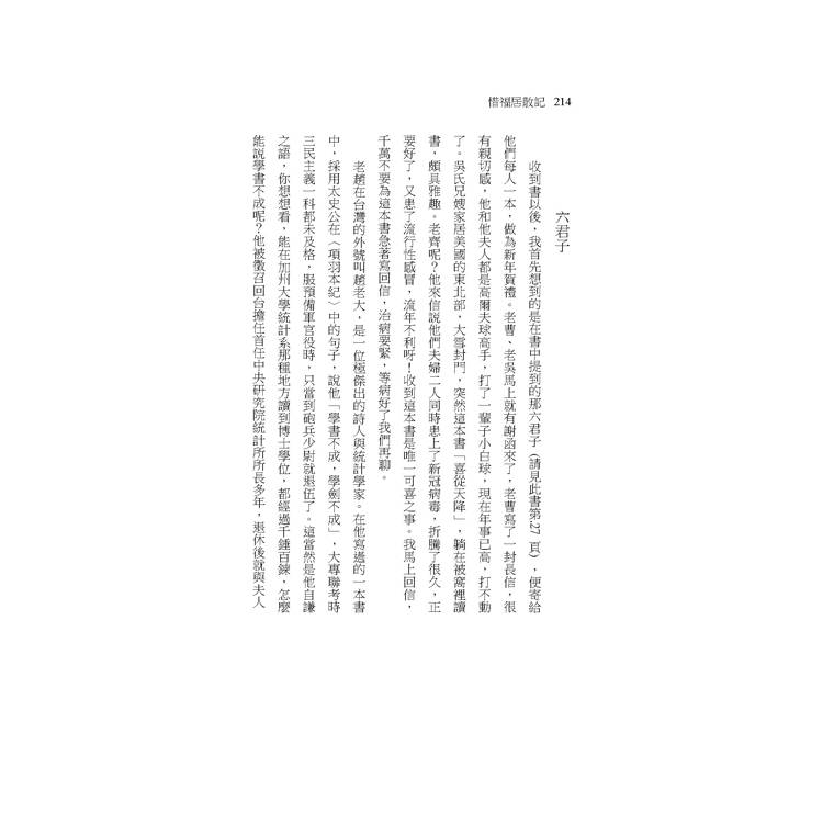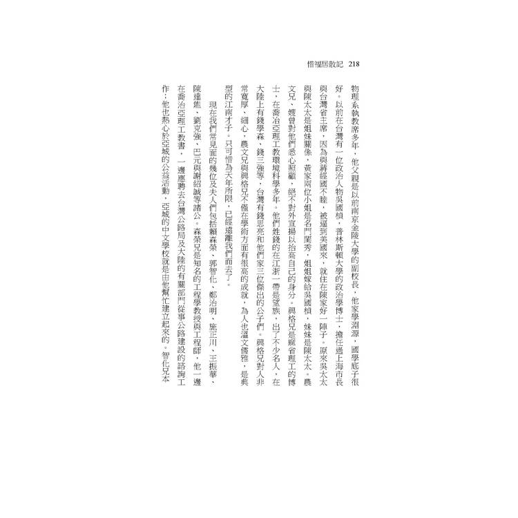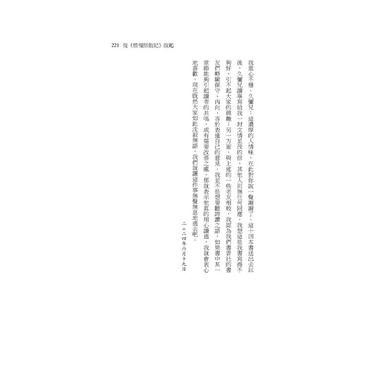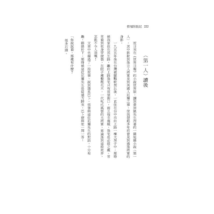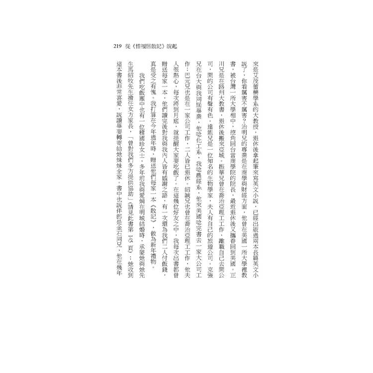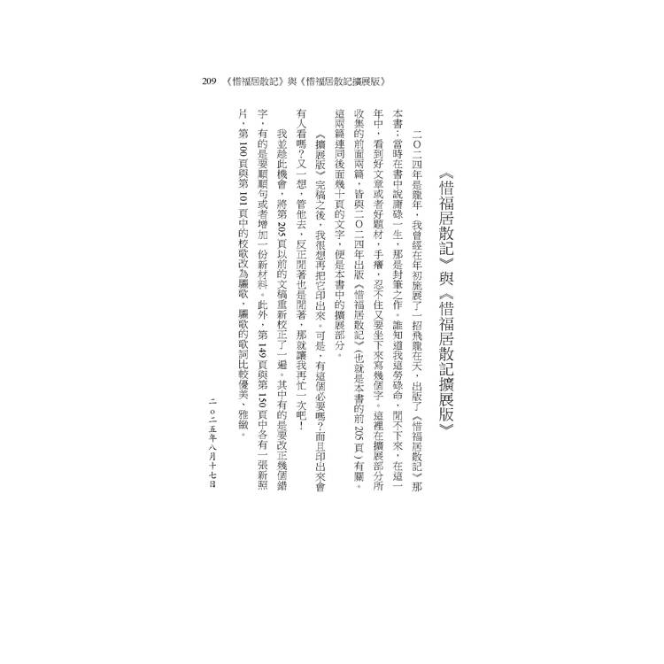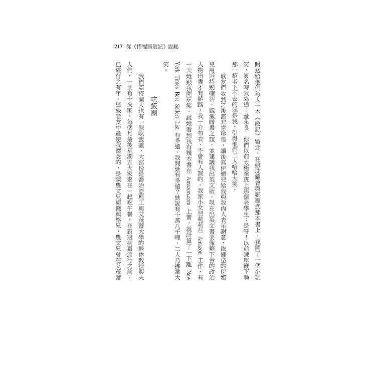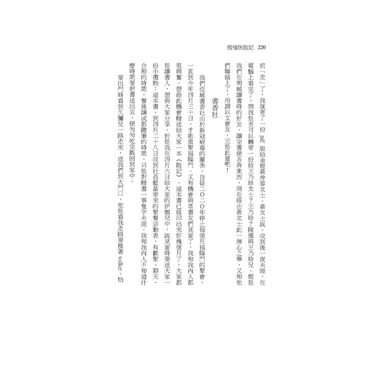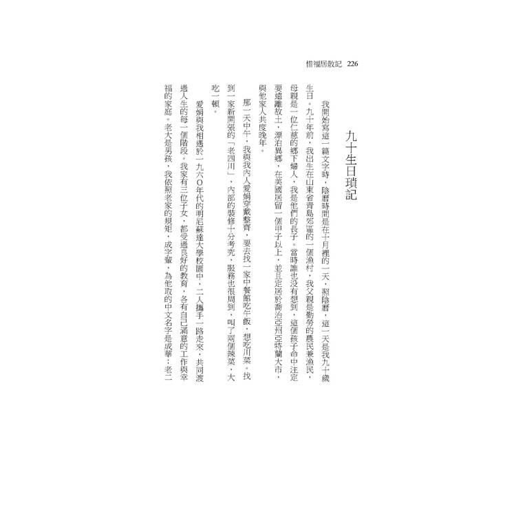 本書是美國董永良教授最新作品,全書包括31篇文稿,共205頁。其內容涵蓋各方面,最後的五篇文章是在依照蘇東坡一首詩的前四句,來追憶作者讀書、在學術界工作多年以及退休後的一些舊事。此新版《惜福居散記擴展版》仍由EHG Books出版,除了前面書中31篇文章的修正部分以外,又加上了12篇新寫的短文,是這本書中的最後40頁。其內容亦是與作者的所讀、所聞與所感受有關。《惜福居散記》是從說閒話開始,兩篇文章是〈閒話演講〉與〈閒話筆名〉;現在這本擴展版則是要說說閒話結束,最後一篇文章的題目是〈閒話有關老的人和事〉,文章中說夫妻二人共同走過人生長河中的每一個階段,然後能夠相互扶持共度晚年是福分,也是二人合修的一份功德。全書的最後一句是「願天下有情人皆成眷屬老」,作者於此加上一句:「願天下夫妻皆能執子之手與子偕老」。