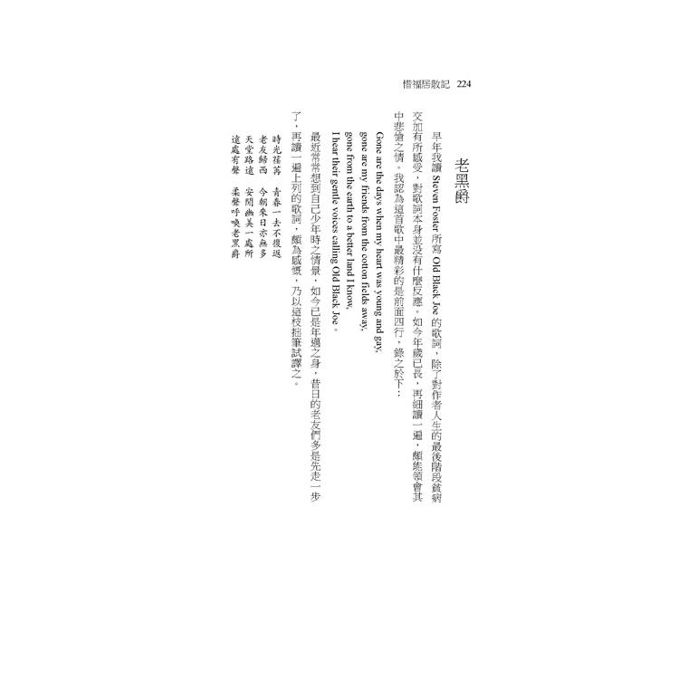 早年我讀Steven Foster所寫Old Black Joe 的歌詞,除了對作者人生的最後階段貧病交加有所感受,對歌詞本身並没有什麼反應。如今年歲已長,再細讀一遍,頗能領會其中悲愴之情。我認為這首歌中最精彩的是前面四句,錄之於下: