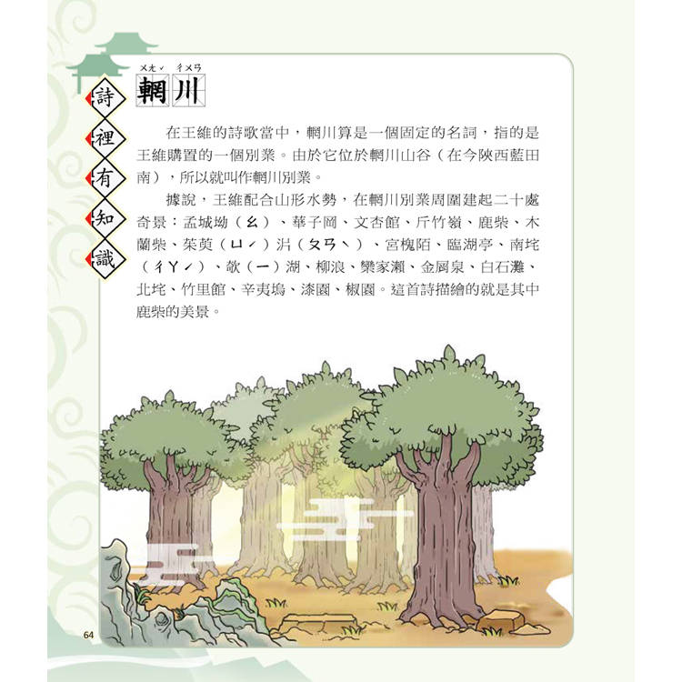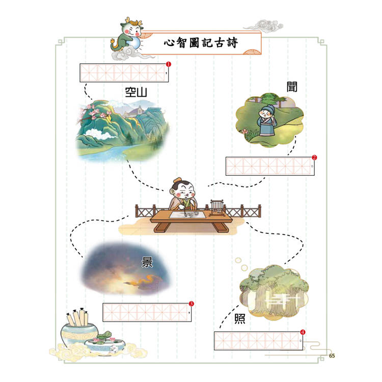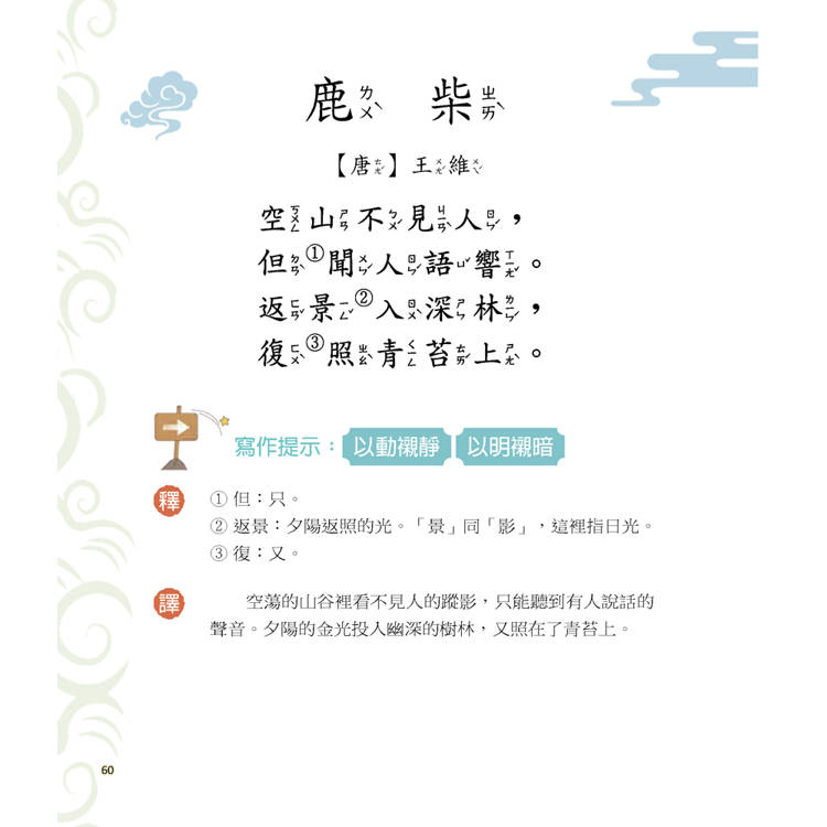 本書以「寫景」為主題,精選〈江南〉、〈敕勒歌〉、〈鳥鳴澗〉等14首寫景詩代表作,每首詩詞附有注音、詳細的注釋、完整的譯文、萌趣的漫畫圖和寫作提示並搭配「背後有故事」、「詩裡有知識」、「心智圖記古詩」單元,帶領中小學生理解詩詞的創作背景和意境,有系統學習成語典故、歷史小常識、傳統民俗等,迅速掌握考試重點,提升國學跨領域素養力,積累語文和寫作素材。
