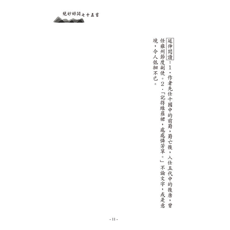 延伸閱讀:1‧作者先仕十國中的前蜀,蜀亡後,入仕五代中的後唐,曾任雍州節度副使。2.「記得綠羅裙,處處憐芳草。」兩句令人低徊不已。