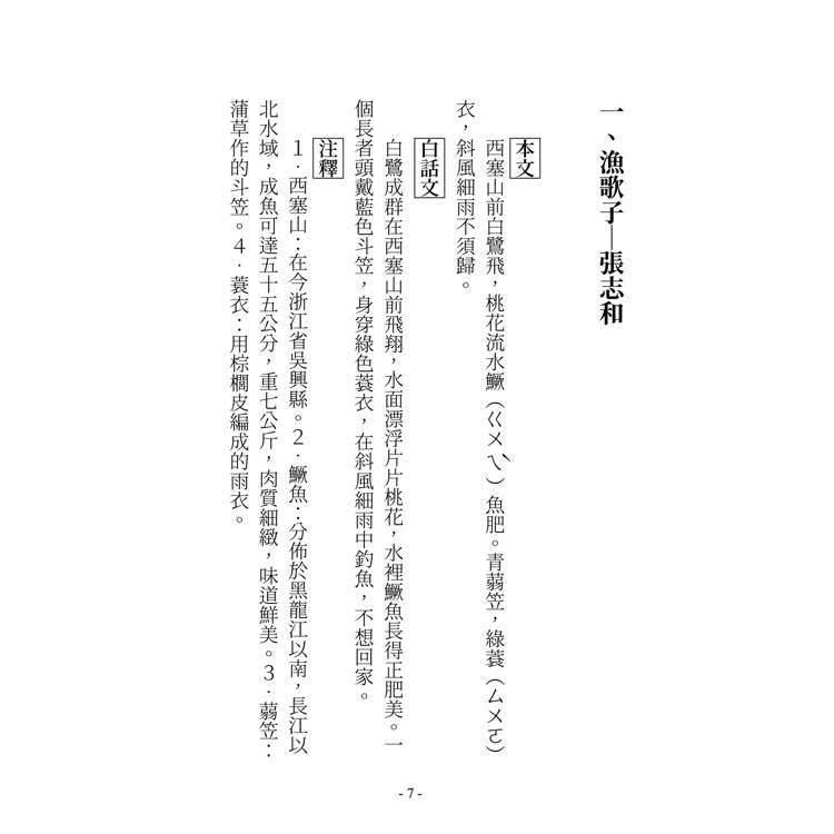 西塞山前白鷺飛,桃花流水鱖(ㄍㄨㄟˋ)魚肥。青蒻笠,綠蔉衣,斜風細雨不須歸。