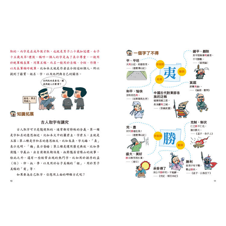 透過「知識拓展」的主題,將歷史背景、國學知識,幫助孩子理解更多文學素養,同時透過思維導讀方式讓孩子認識不同詞性的字詞,一次了解釋義和用法。