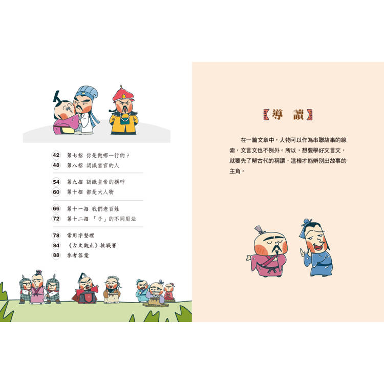 這套書共有六冊,每一冊皆從《古文觀止》中搭配各冊重點,精選出十二篇文章編輯而成。各篇皆包含:劇情回顧、故事原文、字詞解釋、原文翻譯、招式分解、知識拓展及一個字了不得,共七大主題,幫助讀者以輕鬆的方式,理解文言文,不再害怕閱讀古文。