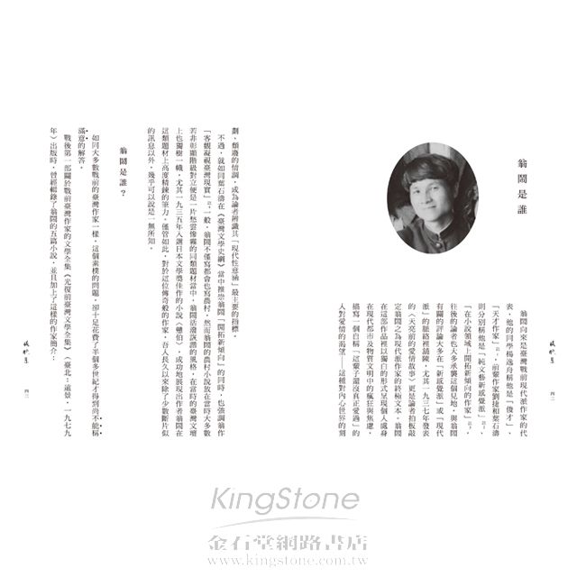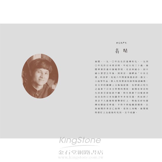 翁鬧,一九一○年生於臺灣彰化,一九四○年死於日本東京。他是臺灣新文學的先鋒者,一個早逝的天才,一個杜斯妥也夫斯基的追隨者,一個漫遊在現代迷霧中的孤獨靈魂。