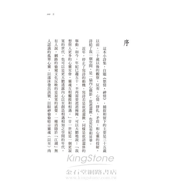 本詩集從慾情出發,經過愛情、友情、親情、世情,以至神情,反映每個人的種種情愫,也側寫慾情與神聖之情的弔詭關係。