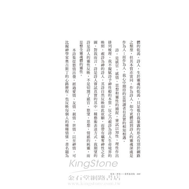 詩,是感官、感情、思想和靈性的捕捉,嘗試以知性、理性作出排列梳理。我不擬賦詩予神性般的本質,反之乃視詩為詩人生命境界的映照。視詩為神的詩人,其詩自然反映如此欲願,而帶有竊奪神性之企圖。對我而言,詩是詩人嘗試真實的其中一種藝術表達方式。我期望的詩是詩人的靈性反映,不是切割了感官、慾望、思想、情感的純靈,而是整全靈魂體的靈性。