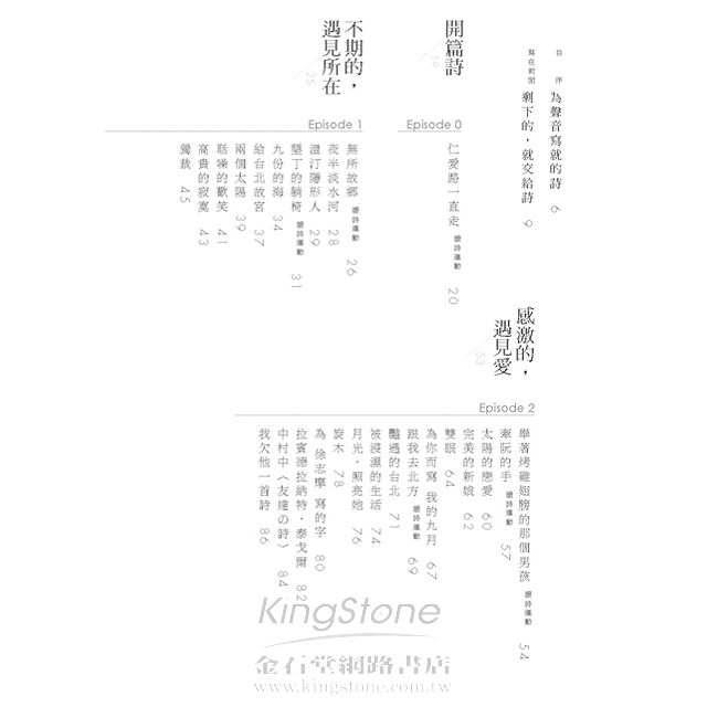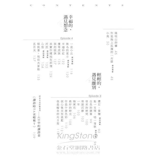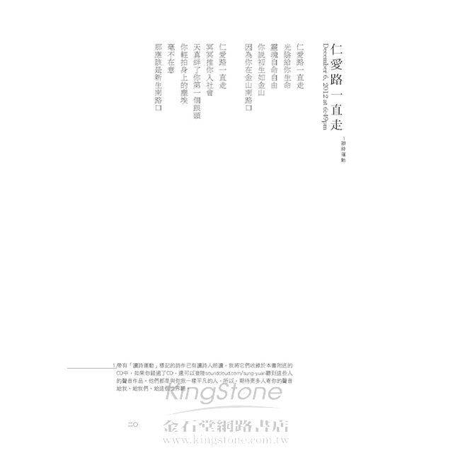 ◎隨書附贈13位讀詩人朗讀CD,聽聽這些人如何為自己讀一首詩,而在網路這裡soundcloud.com/sung-yuan,你也可以聽見不一樣的沉靜、高聳、或是低聲流淌。