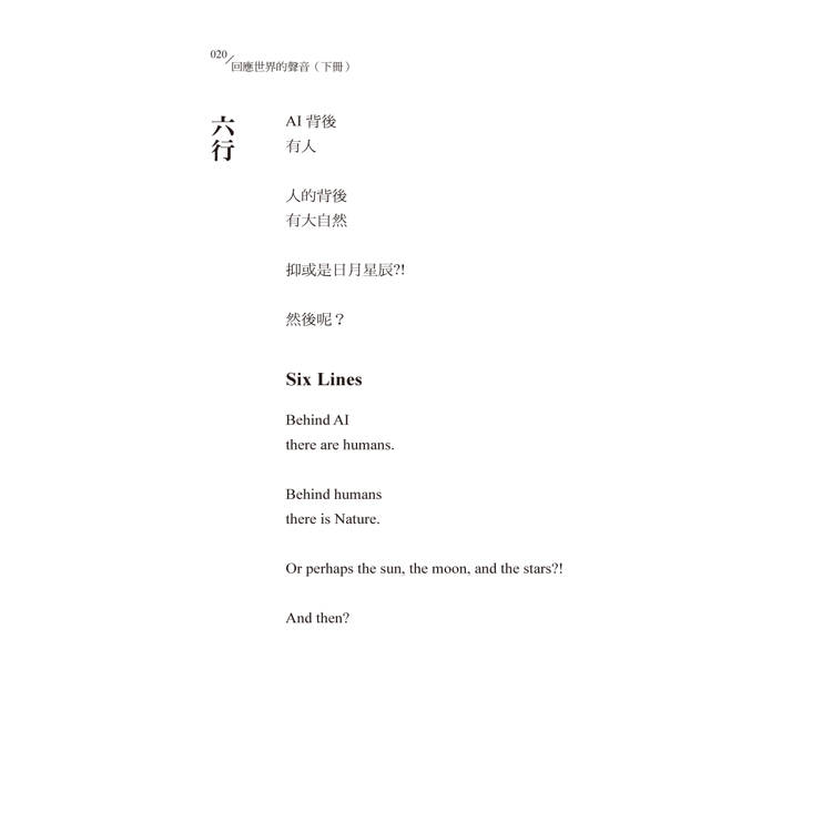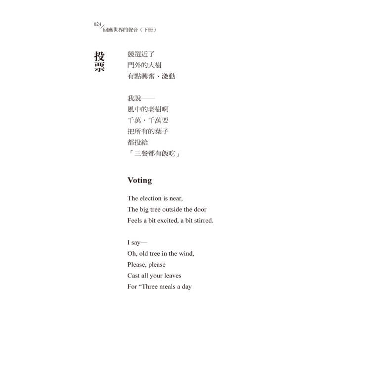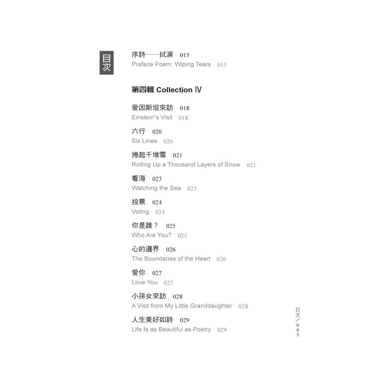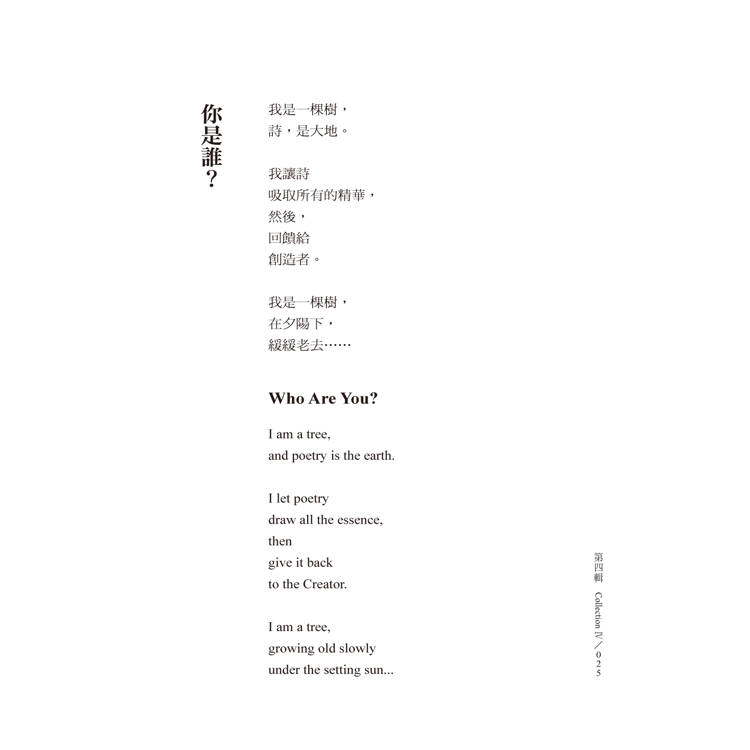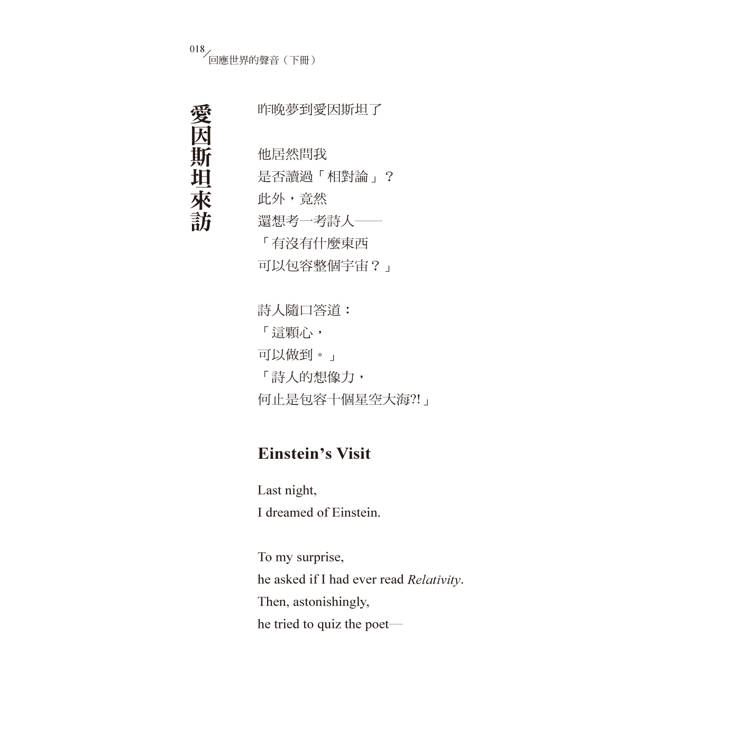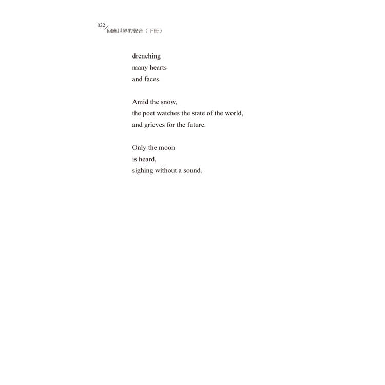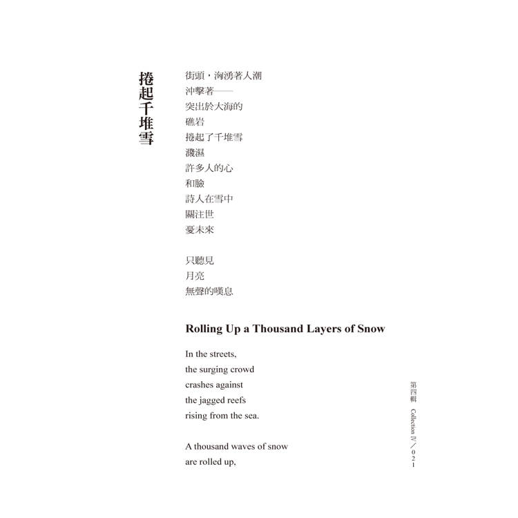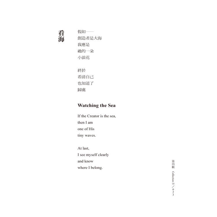 全書以中英文對照呈現,突破語言藩籬,實現詩歌的國際交流,讓英文讀者共享詩歌的力量。