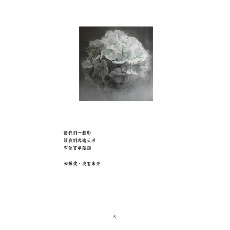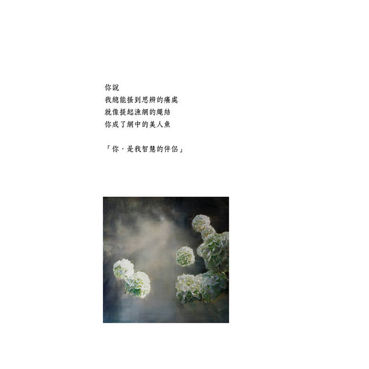 本詩集出版的時候,我的好友,油畫家田忠泉提供了他的《繡球花》系列畫作,作為插圖。忠泉兄是畫壇為數不多堅持以古典的間接畫法進行油畫創作的大師。我們兩個交流甚多,我經常給他誦讀我的詩作,他則向我揭示筆觸和色彩。他在疫情中堅持創作,他在「嘗試著,對靜物做一種超越視網膜的情感性、宗教性揭示,把自己當作微小的存在,把繡球花當作山水宇宙來描繪。」這些創作理念頗能和《宇宙中的一根鳥羽》的詩境呼應。相信這些畫作將給本詩集的讀者,帶來額外的視覺審美,詩畫共鳴。