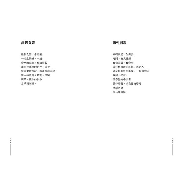 「詩通常在夜裡寫成,然後入夢反芻。與此同時,未洗的杯盤無眠發亮,就像歷經亂離與磨難的室樂團,是時候讓碗裡的黑暗把自己再浣洗一遍,把深刻還給今天。」——詩人自述
