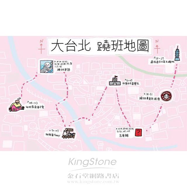 開頭目錄便是一張「大台北蹺班地圖」,依五個不同單元,彎彎要帶領大家一起:「最好是可以每天蹺班」、「蹺班兼差拚經濟」、「好想回去當學生」、「放假最Happy」、「我的家庭真可愛」。