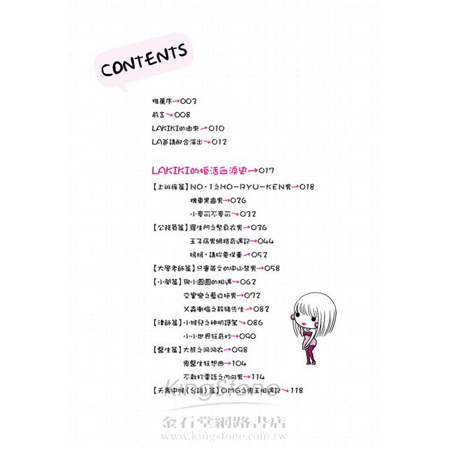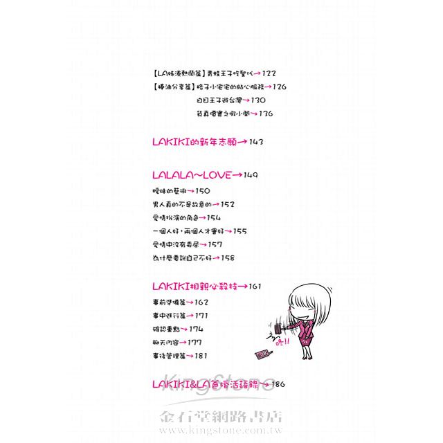 這次受LAKIKI之託幫忙寫序,又忍不住重新看了一次,發現LAKIKI的婚活日記,真的足以拿來和經典喜劇相比,或者更勝一籌,因為在閱讀的當下,總是不自覺有漫畫格式的搞笑畫面閃過腦海,即使記憶猶新(LAKIKI部落格不過去年十二月才開張ㄟ),知道接下來她「鋪的梗」在哪裡,但不管看幾次,每次看到那些地方,還是忍不住要噗哧笑出聲!