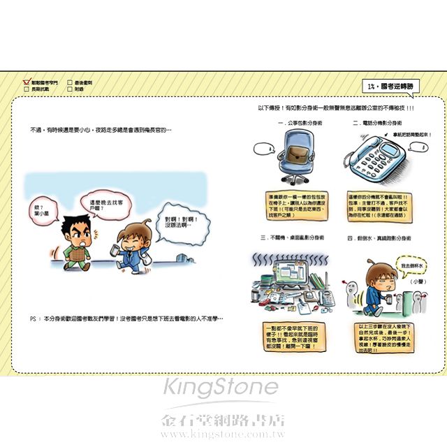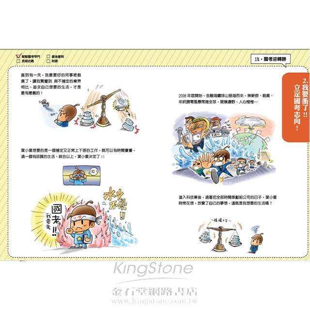 在這本圖文漫畫中,葉小星用他獨特的幽默筆調,畫出了宅男工程師的辛酸,還有如何蒐集國考資訊,選擇補習班,從分類繁雜的公務員系統中選擇適合自己的位置和報考目標。從小到大深諳讀書和整理資料的葉小星也提供他獨門的考試和記憶方法,讓你輕鬆打敗數萬名國考競爭對手,輕鬆選擇你要的人生道路!