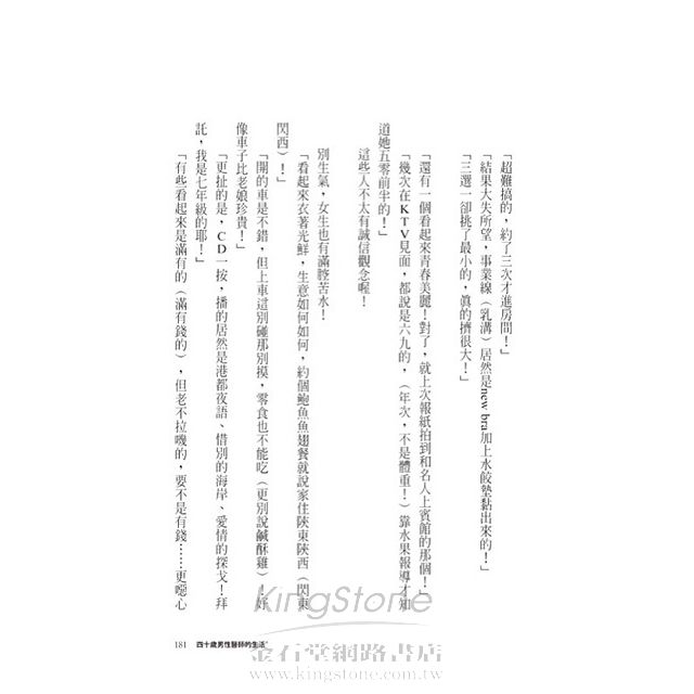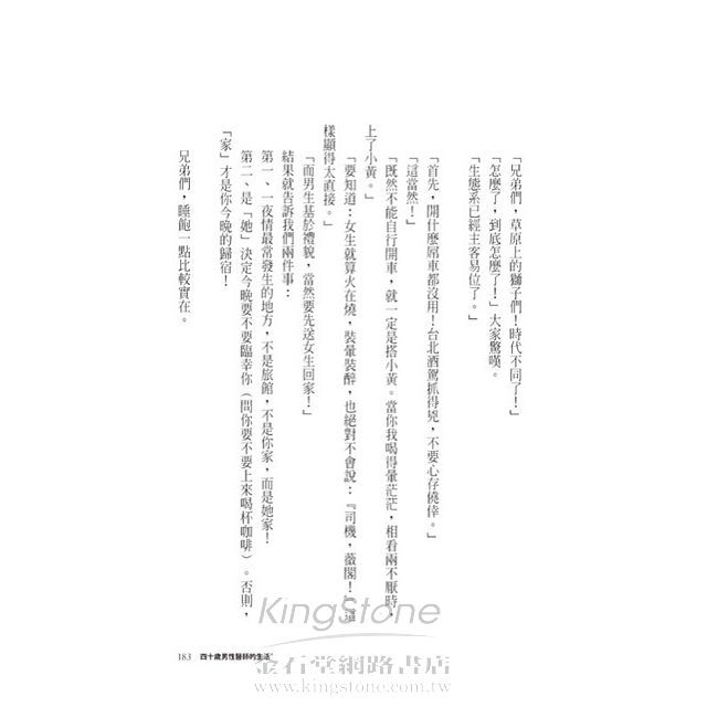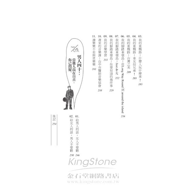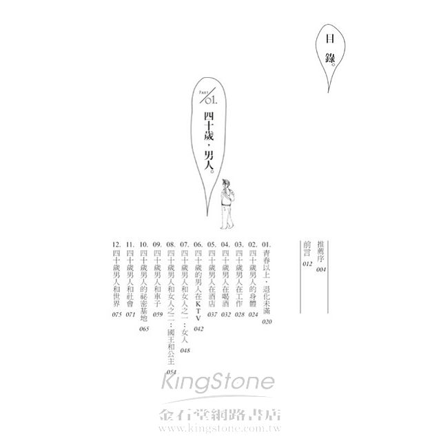 本書真實且詼諧幽默地道出四十歲男人,往前看、往後看都有點吃力的尷尬情愫。對生活、家庭、工作、朋友、夢想、社會、過去與未來,心中的渴望與無奈的心聲……