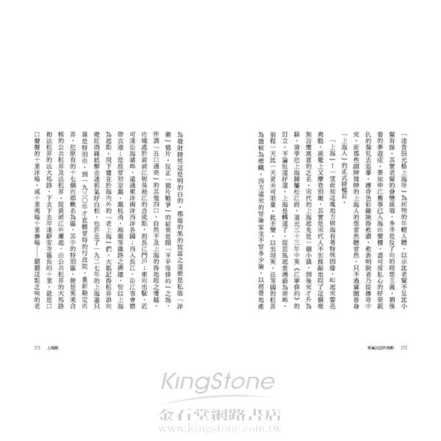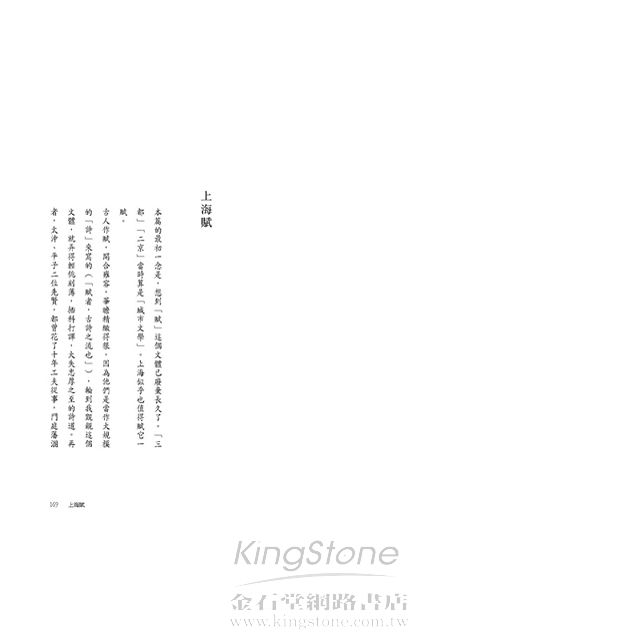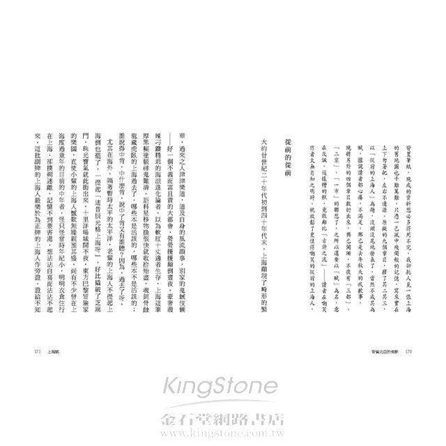 下輯六篇一組的〈上海賦〉,寫上海的歷史、市井、三教九流、亭子間、弄堂,一言以蔽之,舊時上海形形色色,透過木心的筆,活靈活現,每一段皆妙不可言。木心用這樣的方式專寫上海的歷史地理人情風貌,並關心它的去從,應該是前無古人的。〈上海在哪裡〉、〈烏鎮〉,則是木心離開故鄉十多年之久,重返舊地,人事已非,感觸頗多。