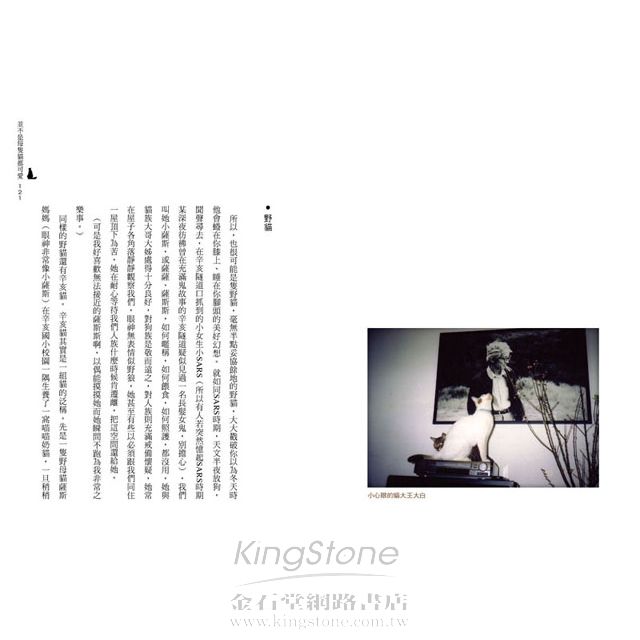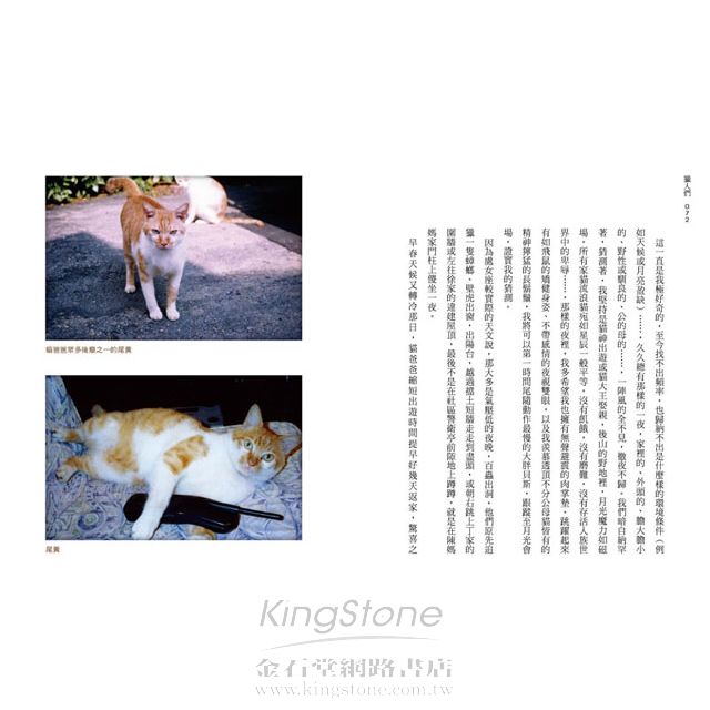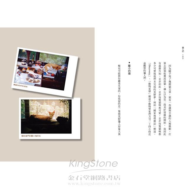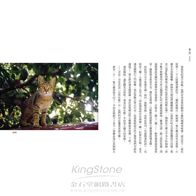 所以,這不只是一本只寫家中那幾隻可平安終老的可愛貓族的書,也不只是寫家門前幾條巷弄街貓的書,它妄想寫下在人族占盡一切資源的世界裡試圖生存的貓族的生涯處境(甚至傳奇),最終,它也許不過想見證他們的匆匆來去一場。