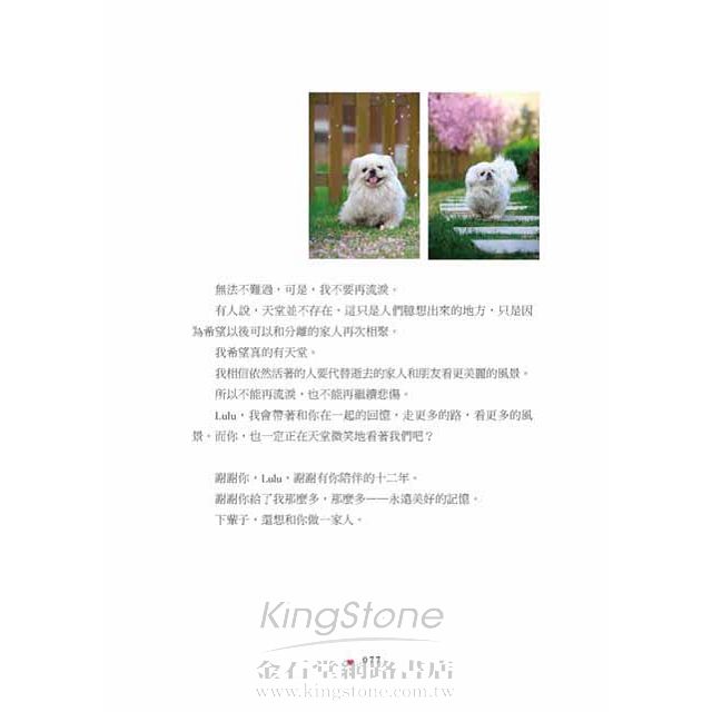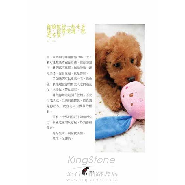 淺白色的《給親愛的花生》中,花生這隻紅貴賓狗是室友的寵物,但依然在作者的生命裡留下深刻印記,「有人帶你回家,餵養你,照顧你,你便願意跟他去任何地方。你是如此溫暖鮮活的存在,怎麼可能被歸進『不能帶走的回憶』一類裡?」
