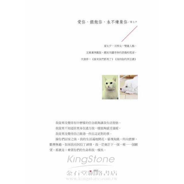 在夏七夕的《愛你,餵飽你,永不嫌棄你》中,家裡已有一隻小白貓之後又再添上一隻薩摩耶犬,讓生活更加充實與飽滿,「雖然他們打碎了我很多昂貴的東西,雖然他們經常佔我的床,雖然他們睡覺會打呼,雖然他們會搶我的食物,雖然我每天都要幫他們清理臭臭的糞便。可是他們會一直陪著我,會在我孤單的時候鑽進我的懷裡,會在我對這個世界失望時,用他們無辜的眼神溫暖我。得貓狗如此,夫復何求。」