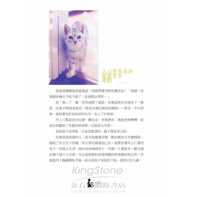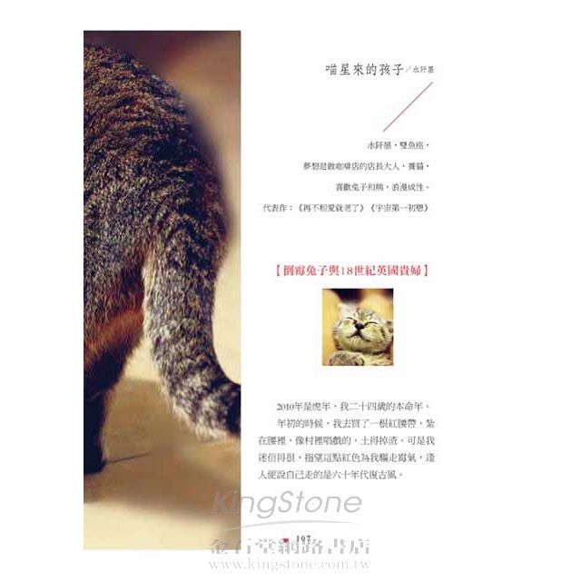 在水阡墨的《喵星來的孩子》及阮笙綠的《永遠》中,各有兩隻小貓在兩個作家的生命裡佔有重要的位置,「當一個巴掌大的小東西的一生,如宿命般依附在你的生命裡,人的心臟究竟能柔軟到什麼程度?我不知道,我已經融化了。我握著她柔軟的小爪子輕輕地說:『約定好了,我照顧你一輩子哦。』」