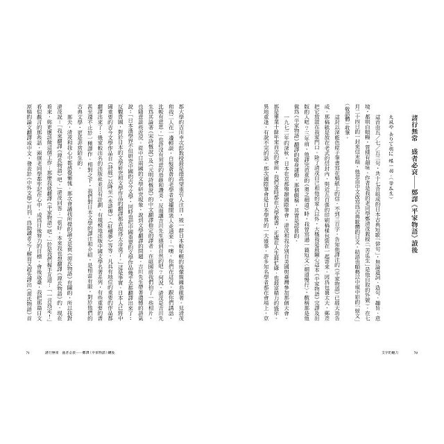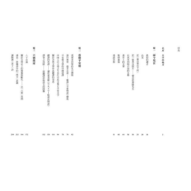 輯二「落櫻平安朝」的文字魅力在於翻譯之筆。自一九七三年以降,陸續翻譯《源氏物語》《枕草子》等日本古典經典,「落櫻平安朝」即為書寫翻譯時的甘苦與點滴,穿梭於「同文同種」中日兩國語言之間,將同與不同,轉譯為優美的文字。