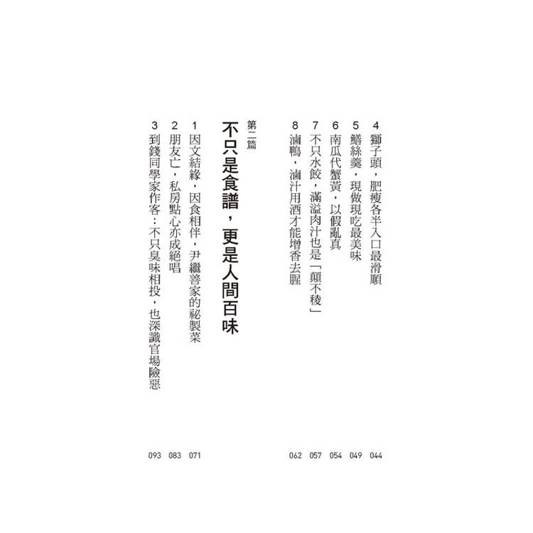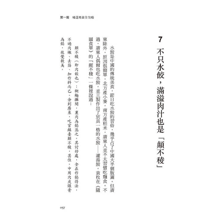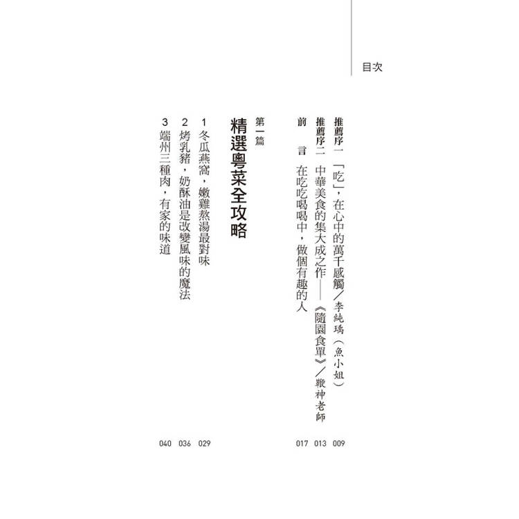 不同於其他解讀《隨園食單》的著作,作者不只單純為其作注,更貼心的幫讀者從三百多道菜餚中精選有故事、有趣味的美食,並將之分為〈精選粵菜全攻略〉、〈不只是食譜,更是人間百味〉、〈不只美食,也談茶論酒〉與〈袁枚的講究〉等四大部分。