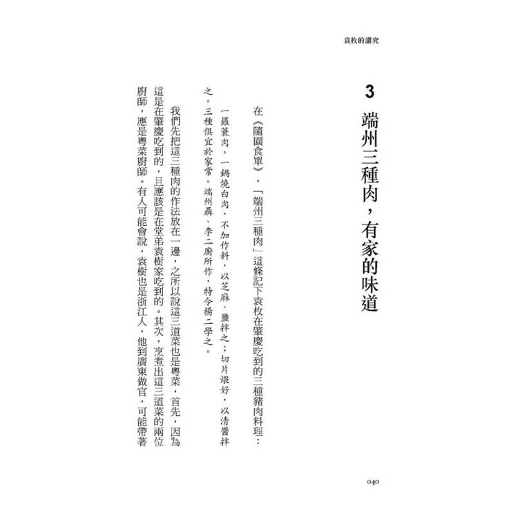此外,袁枚的講究,不光是烤乳豬、燕窩、螃蟹等大菜或珍稀食材,連臺灣的黑白切或滷味中常見的豬肺和豬頭肉,都詳盡細膩的描述其烹調方式。對此,作者總結道:「所謂美食,不在價高物貴,而在於用心烹飪。」